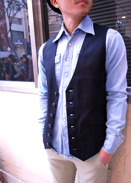 裏生地も付けられた男前のベストはコーディネートの幅が広がります。にこ