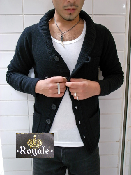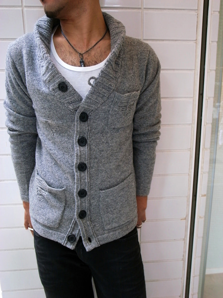 手編み感のあるニットを使いダメージされたような編み方で男らしさを出しているカーディガンです。