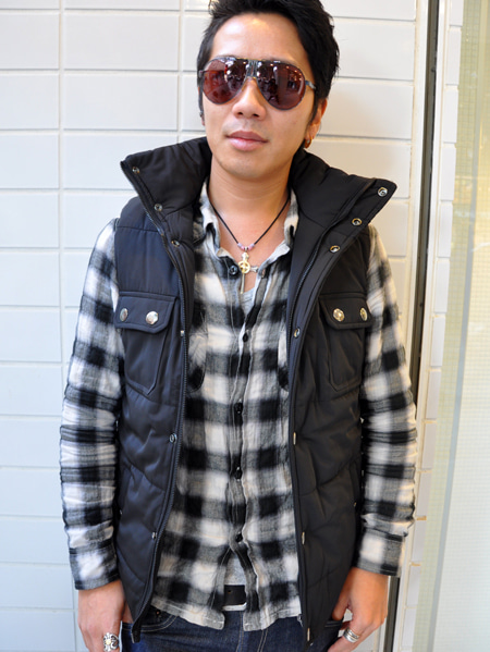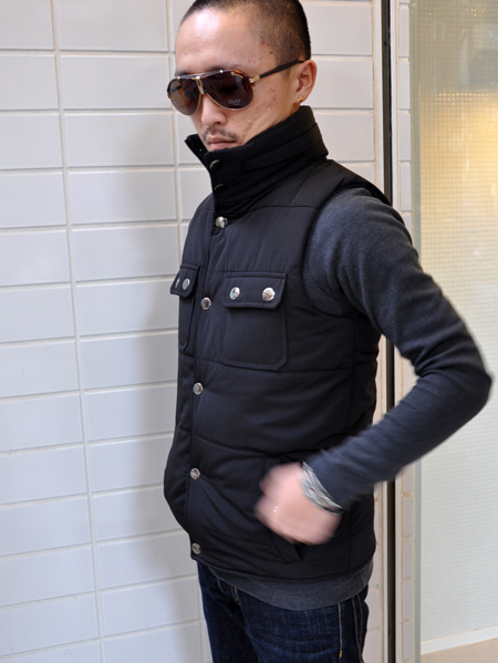 ライズの秋冬のラインのカモフラージュベストをオールブラックにしてもらいアメカジだけでなくモードでも使えるように別注しました。
