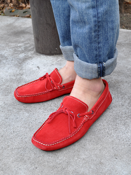 ロールアップしたパンツに赤もドライビングシューズがポイントです。