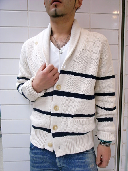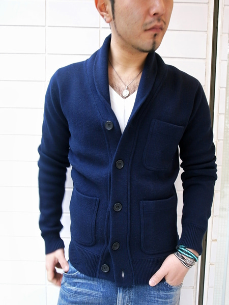 少しミリタリーライクな男っぽいショールカラーのカーディガン