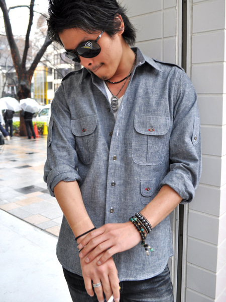 無骨で男っぽいミリタリーシャツをシャンブレーで作ることで上品な感じに仕上がっています。