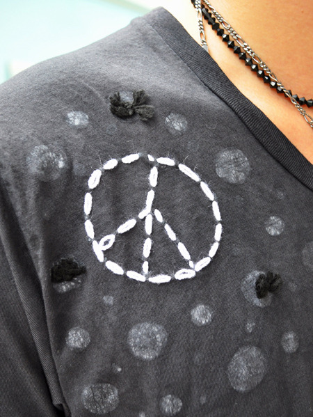 手染めのタイダイで染められたドット柄などに、ピースマークがハンドの刺繍で描かれています。ハッピース