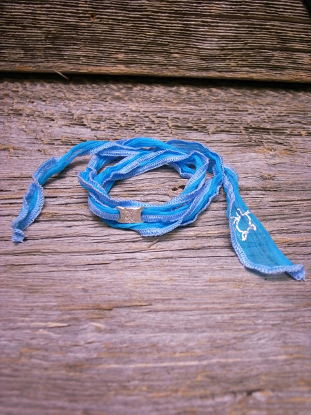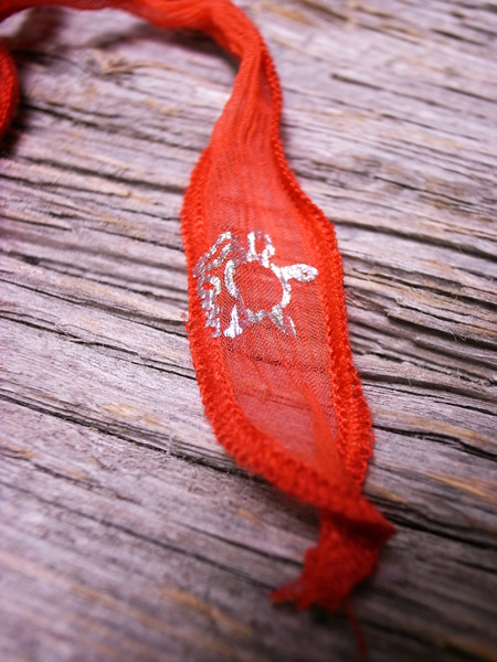 ハンドメイドの銀盤に幸福を招くタートルの柄が打ちつけられシルクのリボンに通されています。