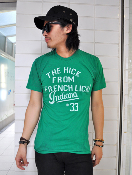 THE HICK FROM FRENCH LICK Indiana (インディアナ州のフレンチリックから来た田舎者)と書かれたTシャツバスケットボール