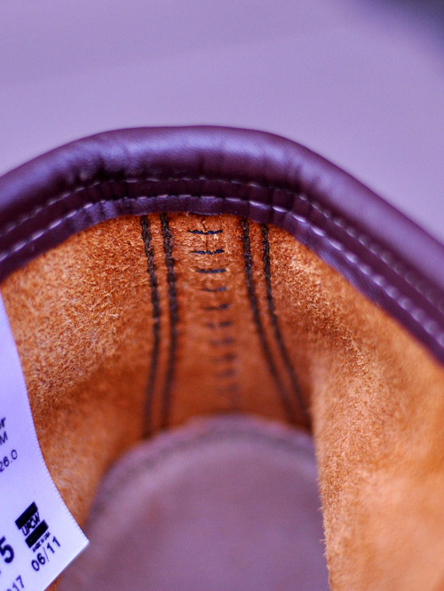 現行品はロックミシンで縫われている後を、古いピューリタンミシンを用いてチェーンステッチで市革を縫いあげています。