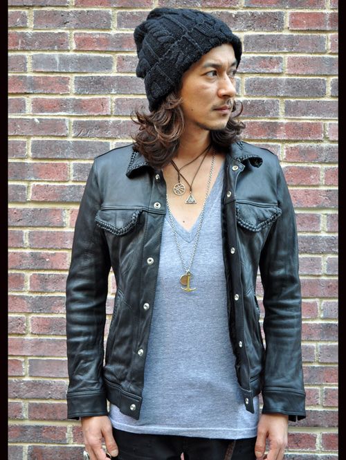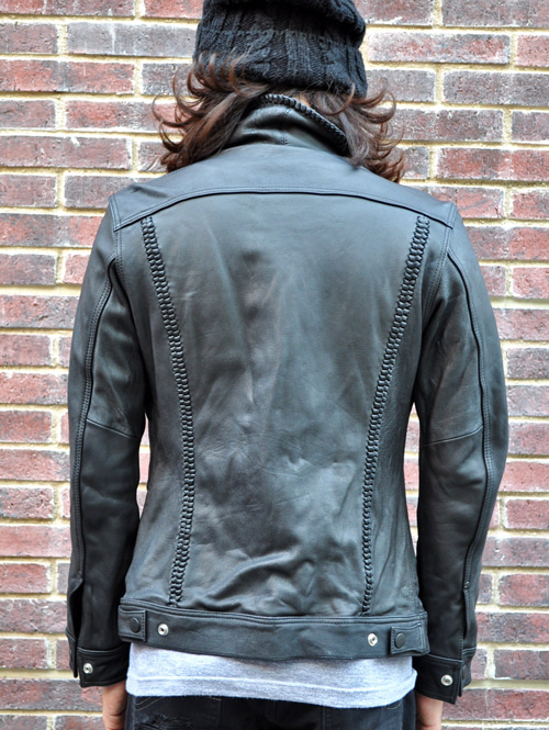 特徴はレザーの紐で、襟やフラップバックの切り返しなどがトリミングされている事