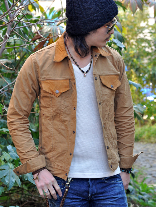 襟とフラップがウォッシャブルレザーの切り返しになっていて
