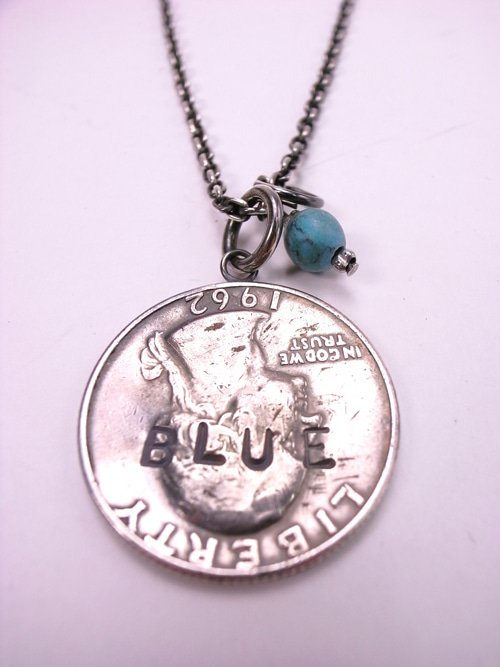 ネックレスが1965年以前のシルバー含有量の高いアンティークコインにBLUEの文字を打ちこみ