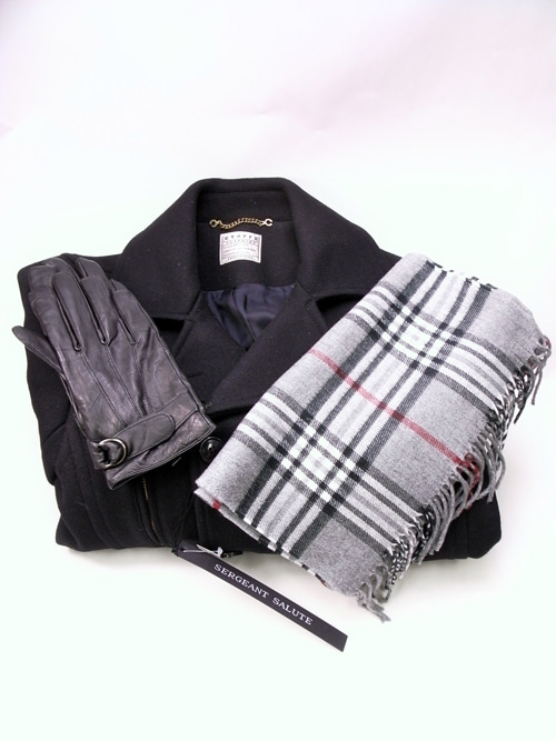 この4ポケのピーコートに手袋とタータンチェックのマフラー付きビックリマーク