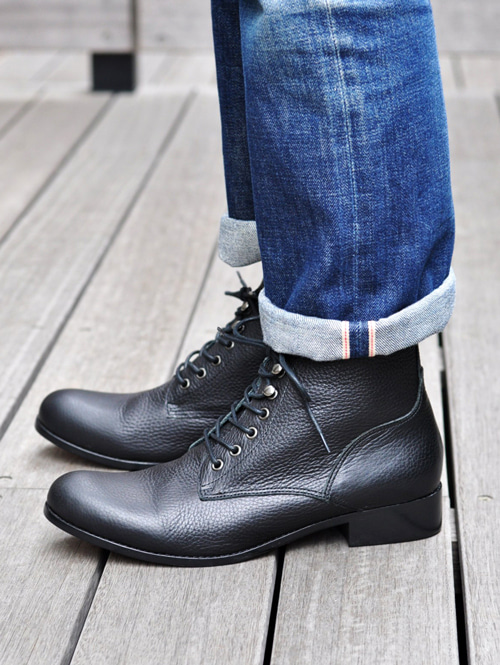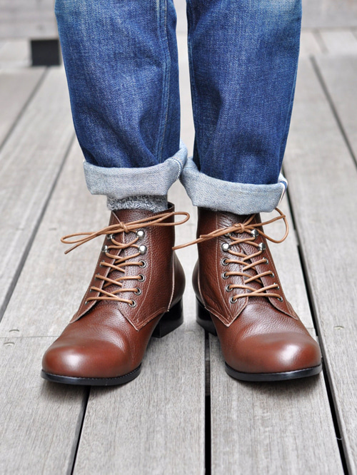 クラシックなブーツをベースに、後にループを付け、前のノーズを若干長くし、前が上がるよう皺を入れたので凄く歩き易いです。