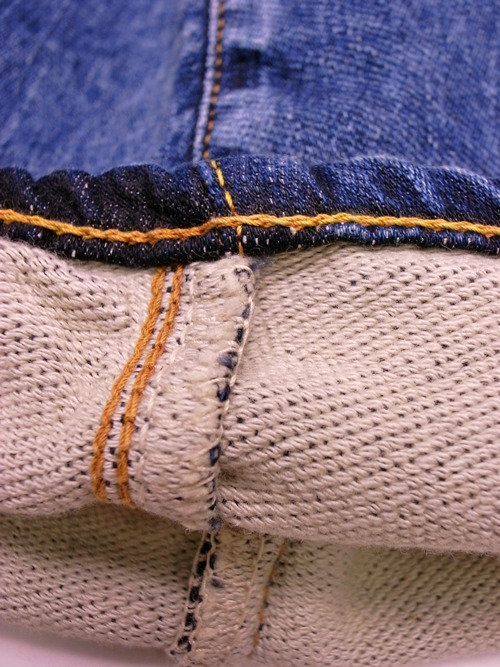 表はデニムパンツのままで、裏がスエットの様なループになっています。