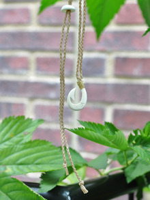 一点作るのにボーンをカットし、削り、磨き、縄を編みあげるといった7-8時間かかる工程をへて作られています。