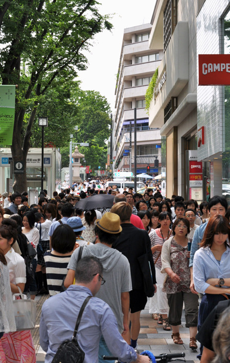 黄色い柵の向こうで並んでいるのがパンケーキ屋さんの行列