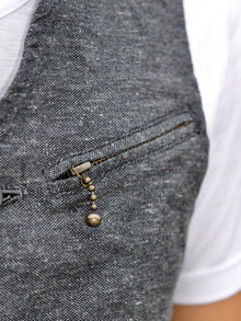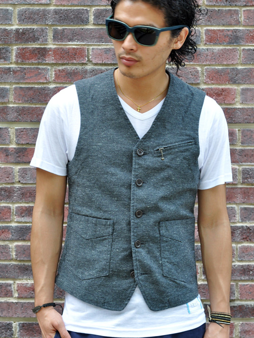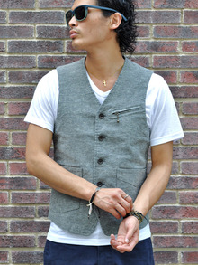 デザインはワークタイプで胸ポケットにボールのジッパーが付いているのでバイカーポクって男っぽいベストです。