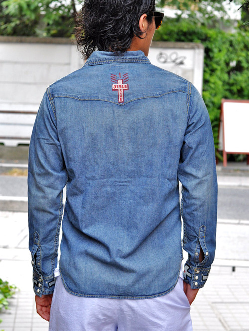 まず初めはオリジナルのデニムシャツにハンドプリントの職人TELVINに頼んで