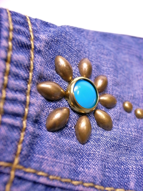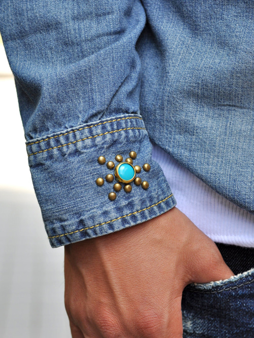 ビンテージ加工のブラスを使い、ターコイズカラーのストーンが映えます