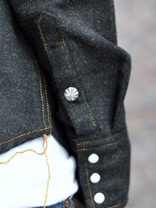 前立てと袖口にラグの生地を貼り、コンチョボタンは付いています。