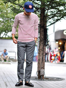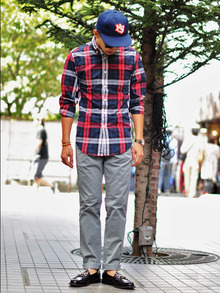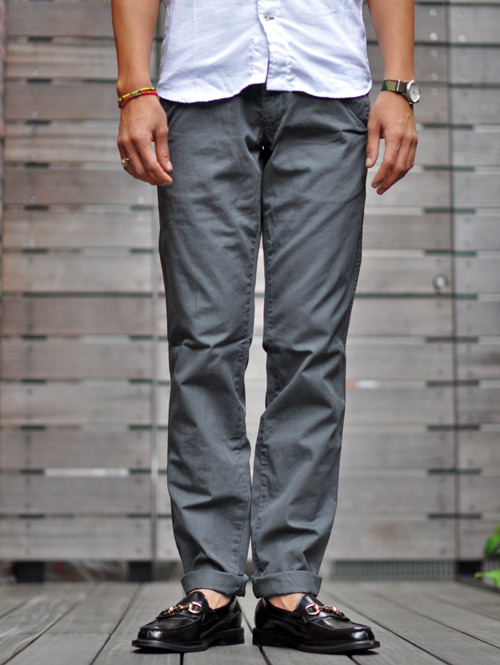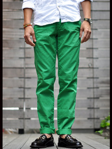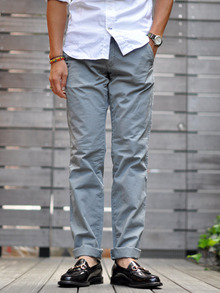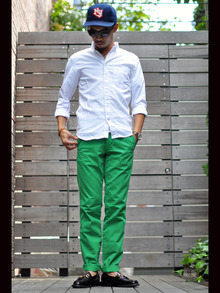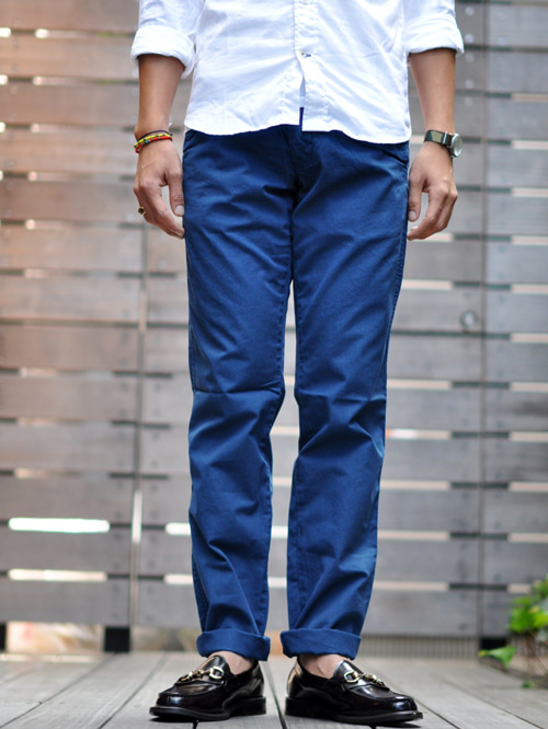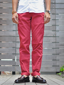 まずは、新ブランドPAPERBACKSのタイトなカラーチノパンツ