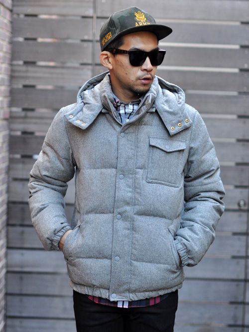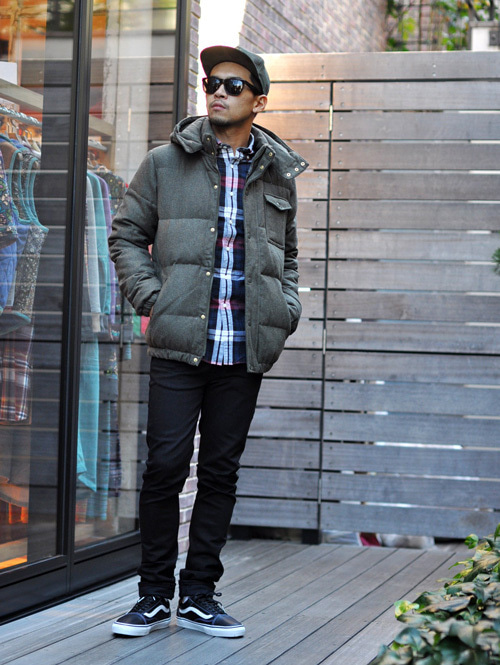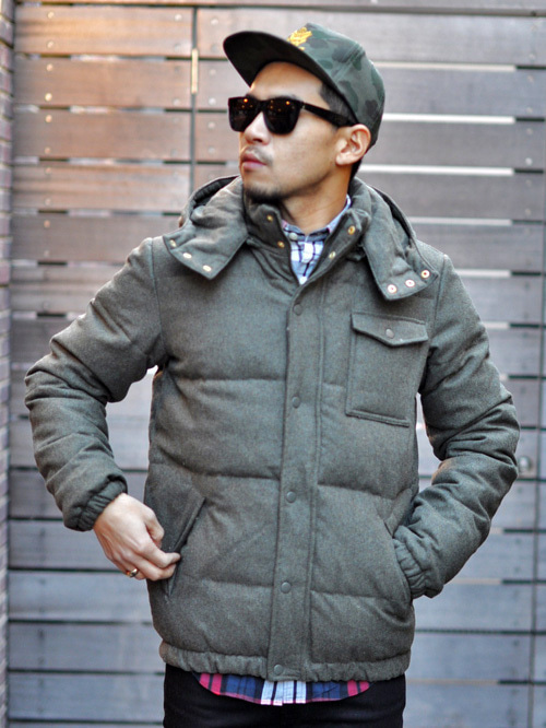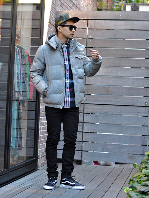 ナイロンのダウンも良いですが、このような異素材もお洒落かと思います。