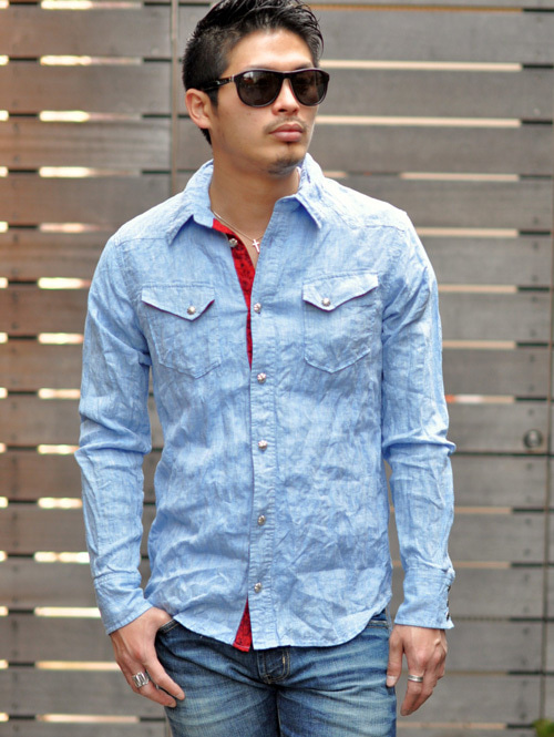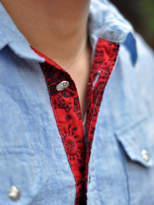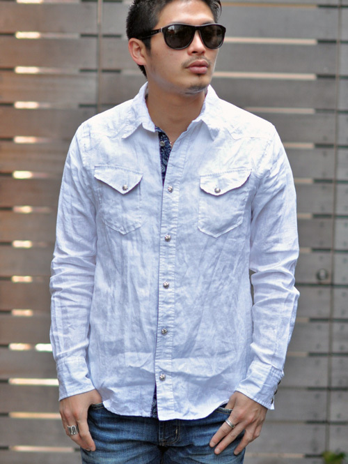 コンチョボタンを使った、麻のウエスタンシャツ