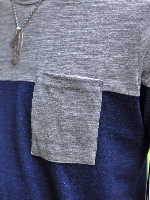 袖とボディーの胸当たりから、違う素材を合わせたバイカラー