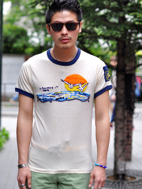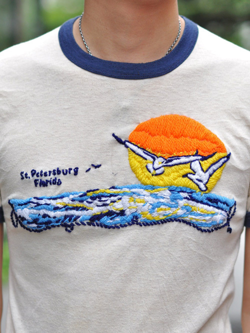 ヴィンテージTシャツに、ハンドステッチで、プリントされている部分に刺繍をほどこしています。