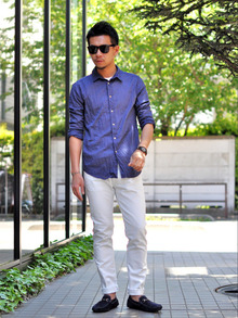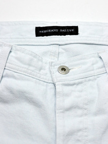 ほとんど白に近いまでにブリーチした淡いブルーのタイトデニムが入荷