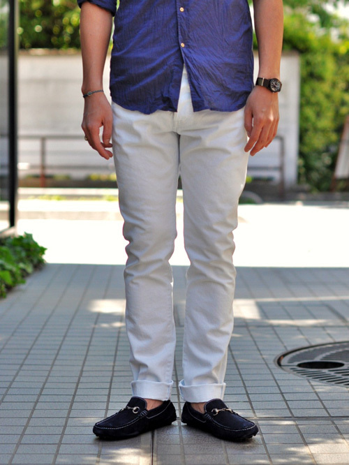 ほとんど白に近いまでにブリーチした淡いブルーのタイトデニムが入荷