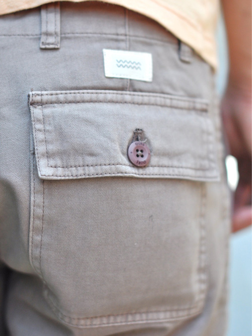 カシメやボタンにOURSのマークの波が入ったサーフなパンツです。