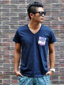 こんな柄物には、今年はしろのVネックなどをシンプルに少し大きめに合わせると良いかと思います。