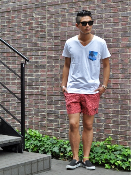 こんな柄物には、今年はしろのVネックなどをシンプルに少し大きめに合わせると良いかと思います。