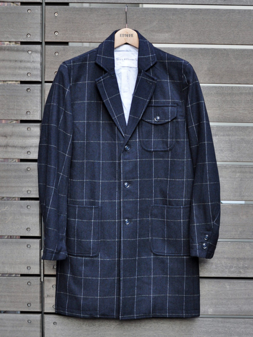 シンプルなチェスターコートに、フラップ付きのポケットを胸に付けた少しカジュアルをプラスしたデザインで