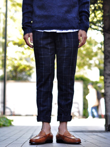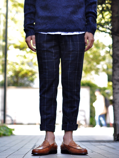 同素材で今年っぽい8分丈のパンツも作っています。