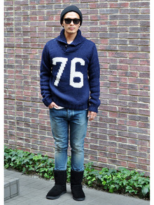 ローゲージなので、ボトムスはタイトな物や、スエットパンツが似合いそう