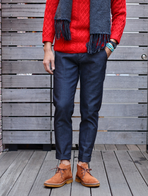 腰回りにややゆとりを持たせ、膝から下が綺麗にテイパードしたデザインで