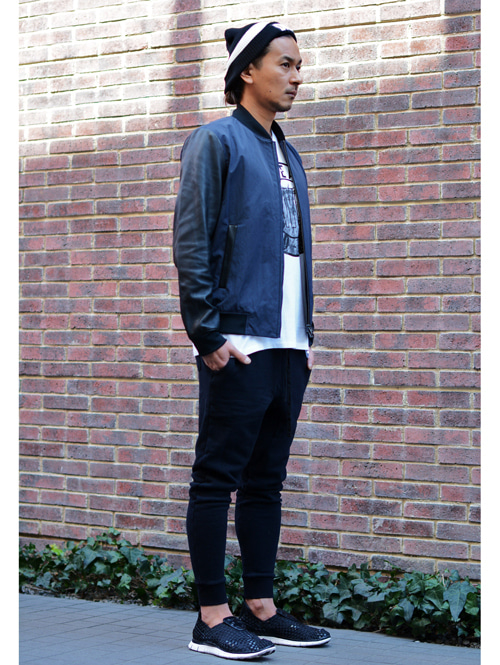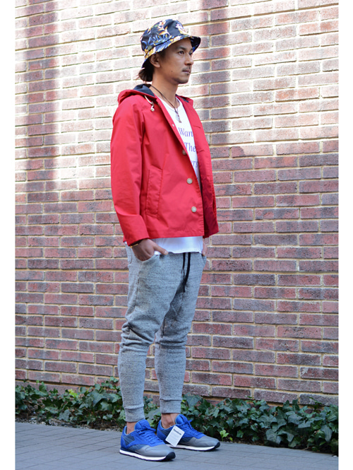 ボトムをスエットに替えるだけでイメージがガラッと変わります。
