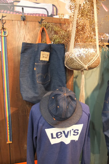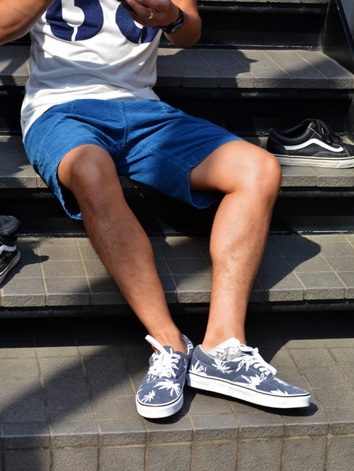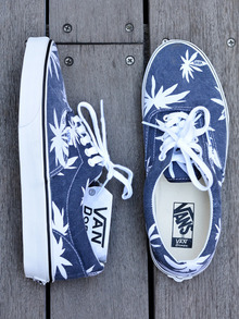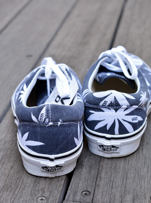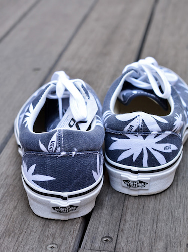 擦れたようなネイビーのキャンバスにパーム柄がホワイトでプリントされています。