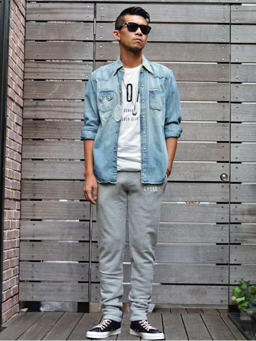相変わらずスエットパンツは人気ですが、こんなアメカジっぽいスタイルもお奨め