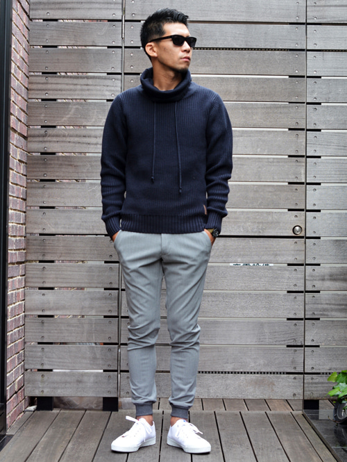 こんなパンツに、バルキーなニットを合わせて革靴でも