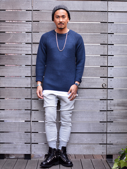 今シーズンはタイトなスエットやブラックパンツなどが多いので