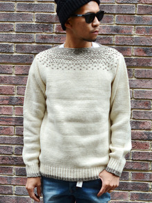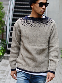 ボートネックのデザインで、ペルー産の毛糸を使いペールーでハンドメイドで編まれています。