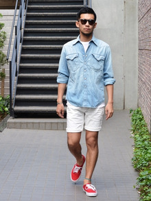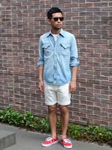 日焼した肌には、こんなデニムシャツが清潔感あっていい