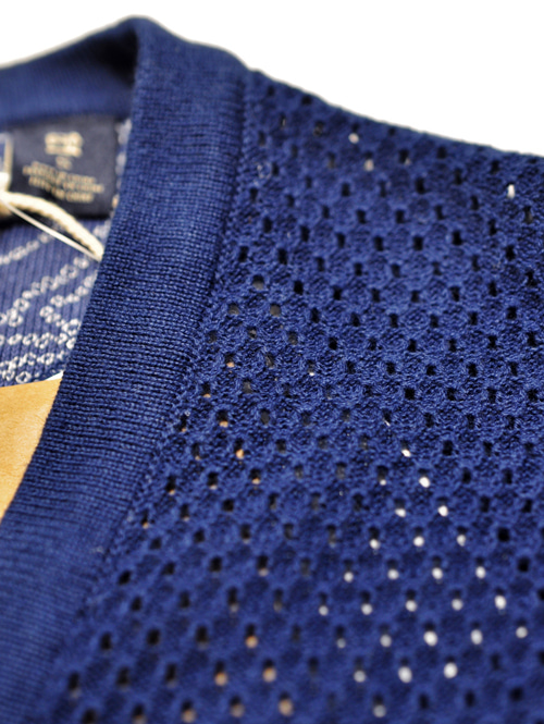 インディゴ染めの糸を使って、メッシュ編みで作られています。