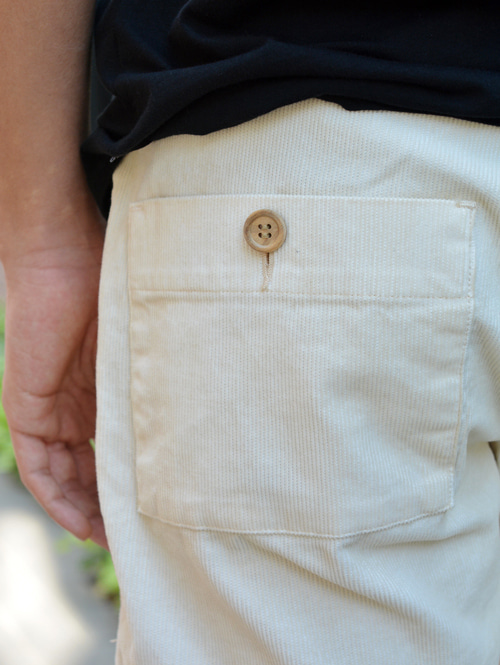 バックポケットがアウトポケットで、ウッドボタンがついています。