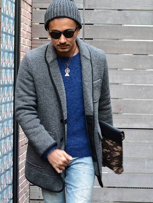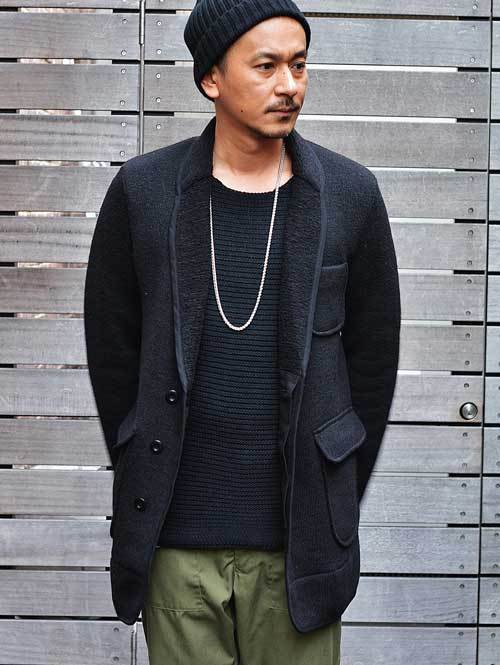 メンズではあまり見かけないニットのチェスターは女子受けもいいです。