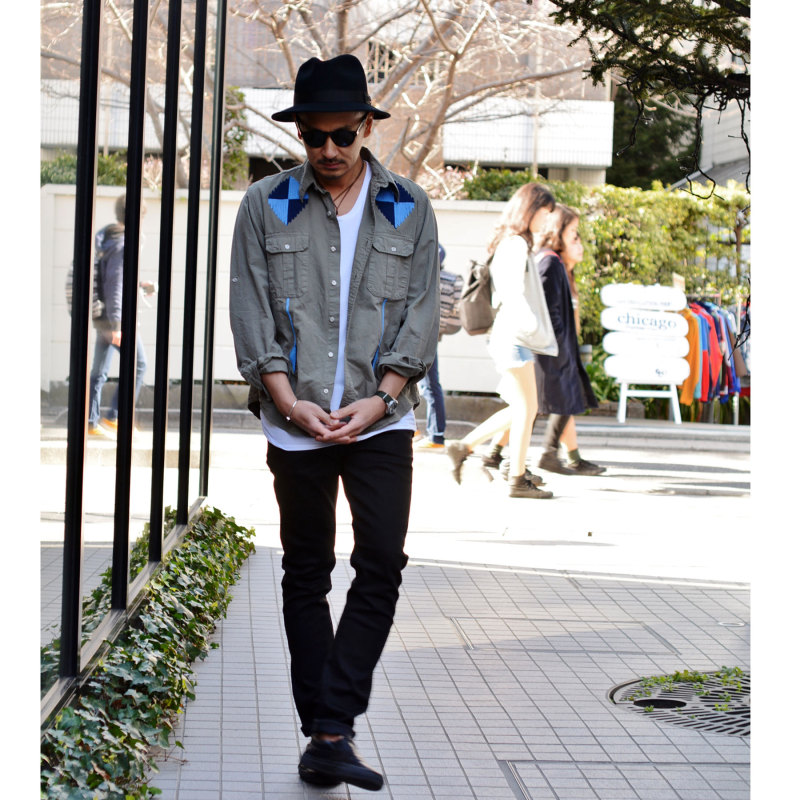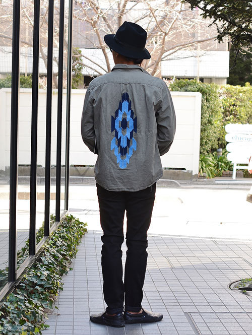 今回はミリタリーシャツにインディアンラグ柄を刺繍で入れたシャツジャケット