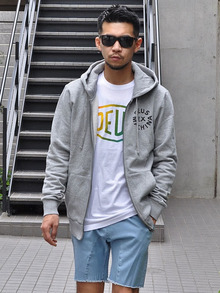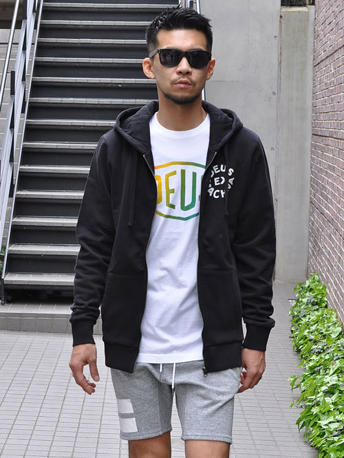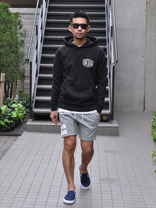 今シーズン人気になりそうなスエットショーツに合わせてみました。