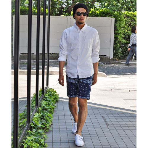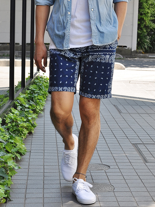 インディゴ染されたバンダナ柄のショーツが入荷