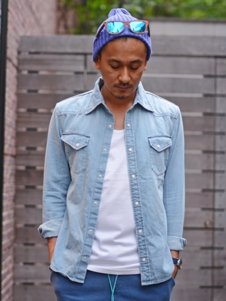 インディゴ染の麻混の生地を使ったサマーシャツで